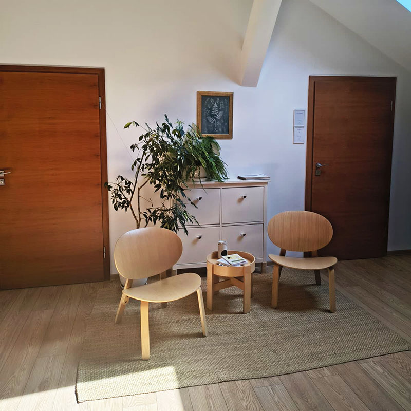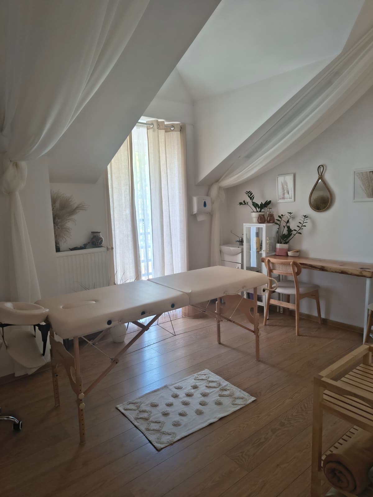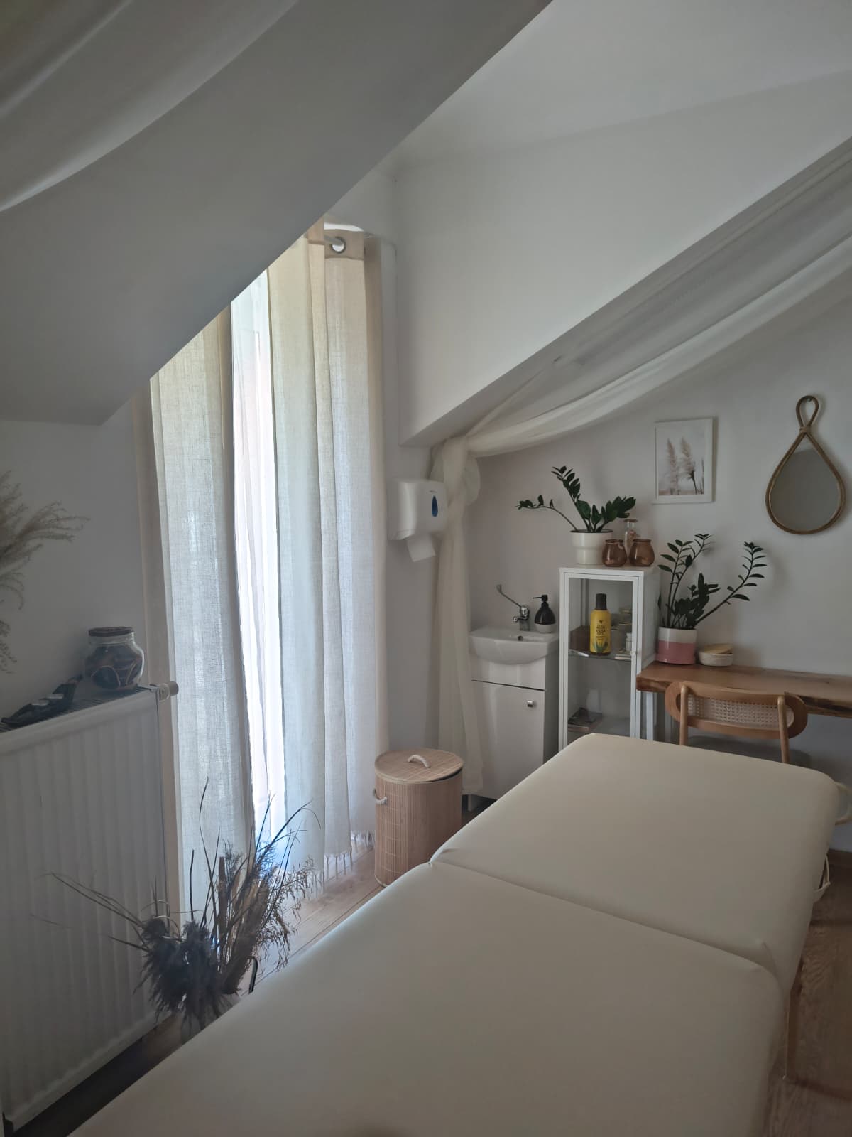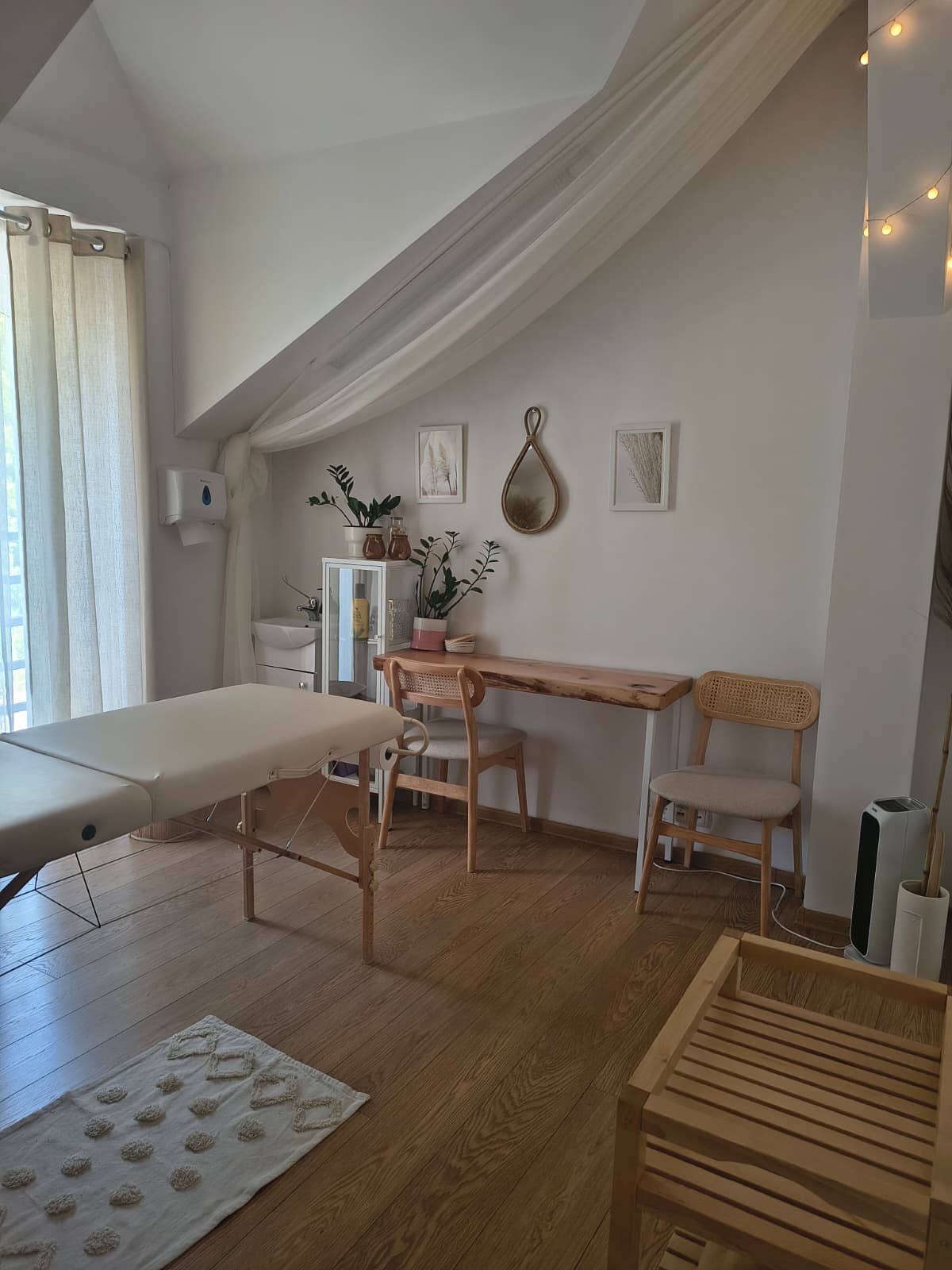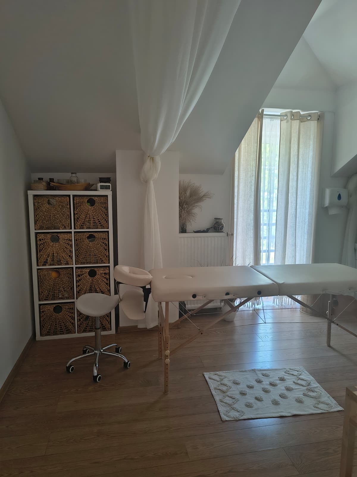 Gabinet posiada stół do masażu, umywalkę oraz stolik z krzesłem. Jest przystosowany do terapii ciała. (14 mkw).