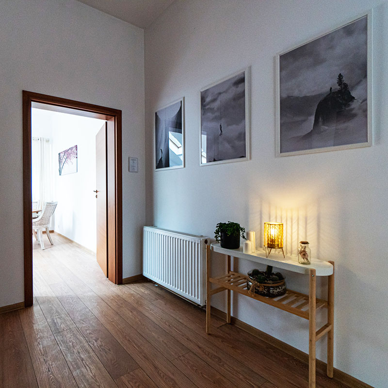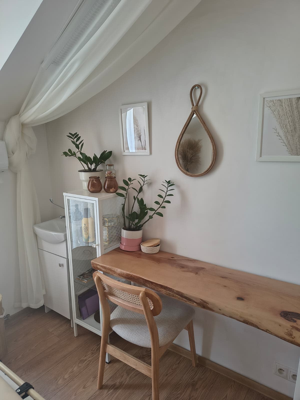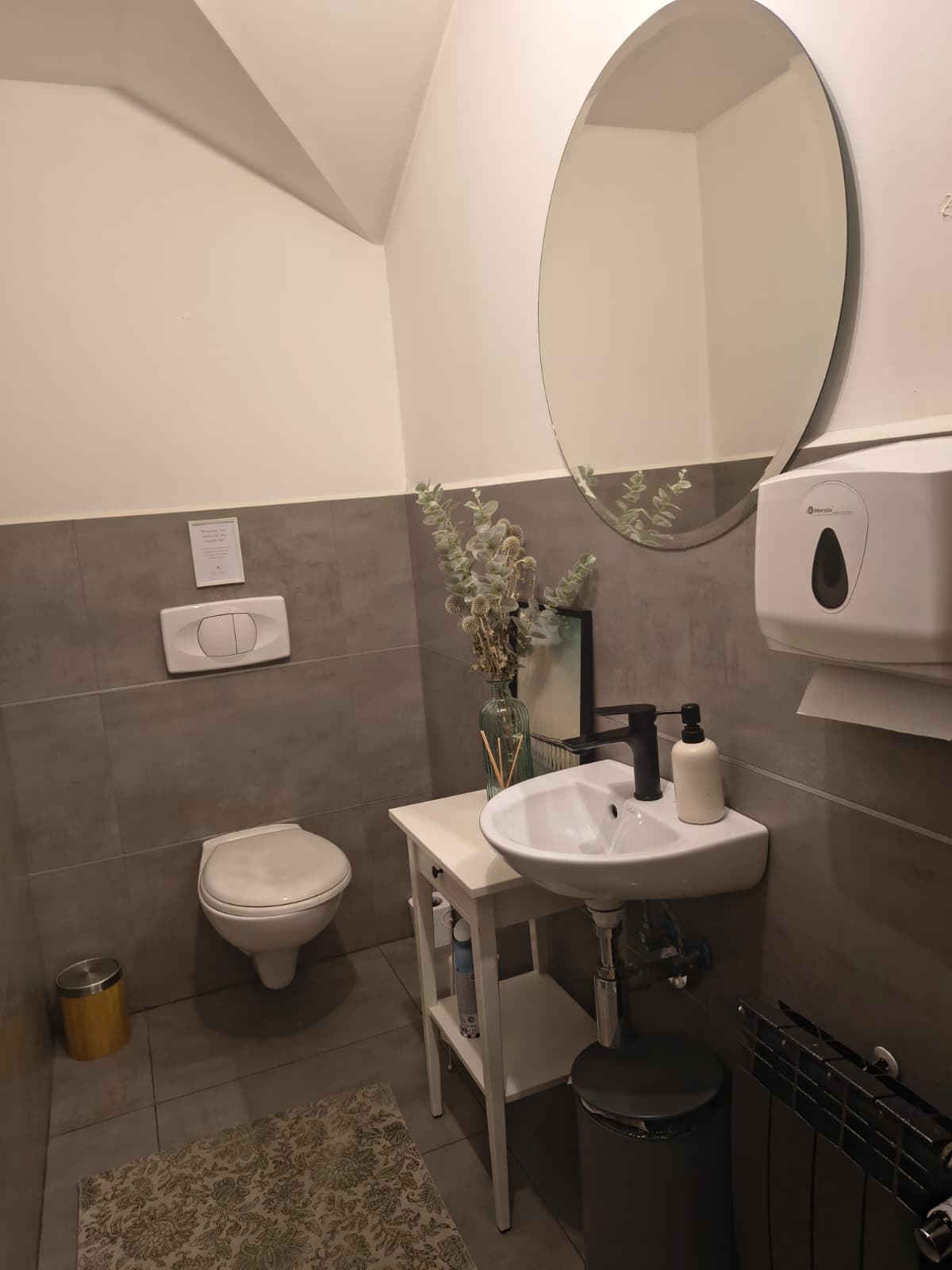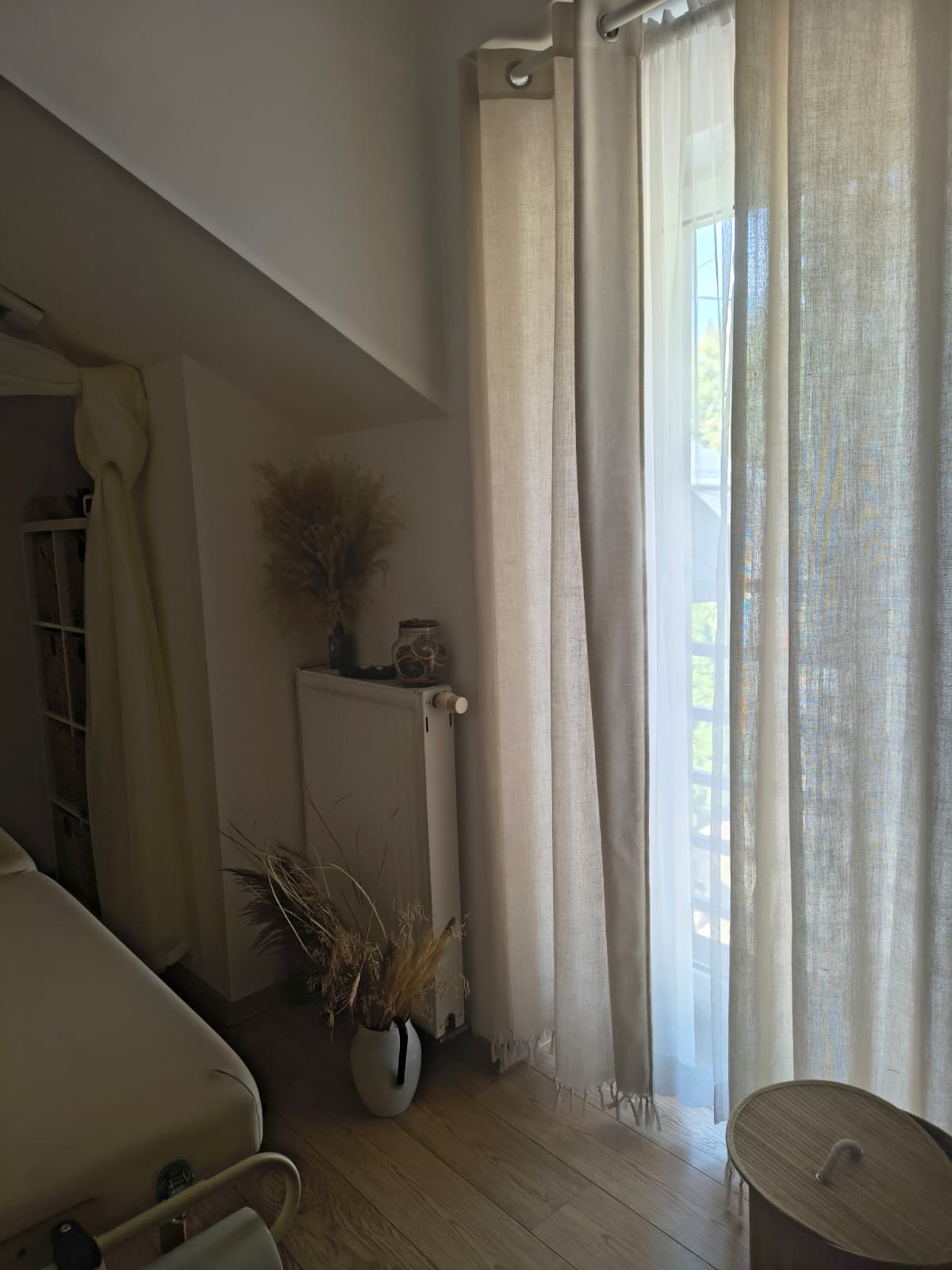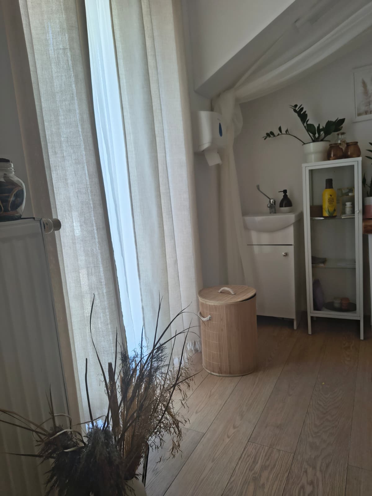 Gabinet posiada stół do masażu, umywalkę oraz stolik z krzesłem. Jest przystosowany do terapii ciała. (14 mkw).
